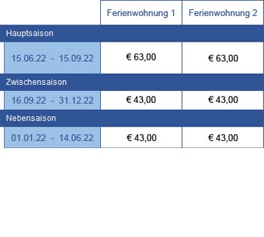 Start Ferienwohnungen Ferienhäuser Lage Kontakt / Impressum Urlaub an der Nordsee Zwei Ferienhwohnungen befinden sich im 1.Stock des Haupthauses von 1998. Sie bieten auf je ca. 60qm ausreichend Platz für 4 Personen.     	1 Wohnzimmer, SAT-TV, WLAN kaufen    	2 Schlafzimmer    	sep. Küche    	Duschbad Gartenmöbeln und Grillmöglichkeit Ferienwohnung 1 Ferienwohnung 2 Hauptsaison Zwischensaison Nebensaison 15.06. - 15.09.2015 20.12. - 07.01.2015 03.03. - 14.06.2015 16.09. - 09.11.2015 22.12. - 10.01.2016 08.01. - 02.03.2015 10.11. - 21.12.2015 € 59,00 € 59,00 € 39,00 € 39,00 € 39,00 € 39,00 € 39,00 € 39,00 € 39,00 € 39,00 € 39,00 € 39,00 € 39,00 € 39,00 Auf Anfrage Hunde erlaubt. Ferienwohnungen
